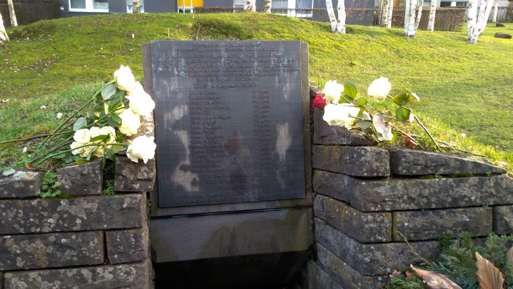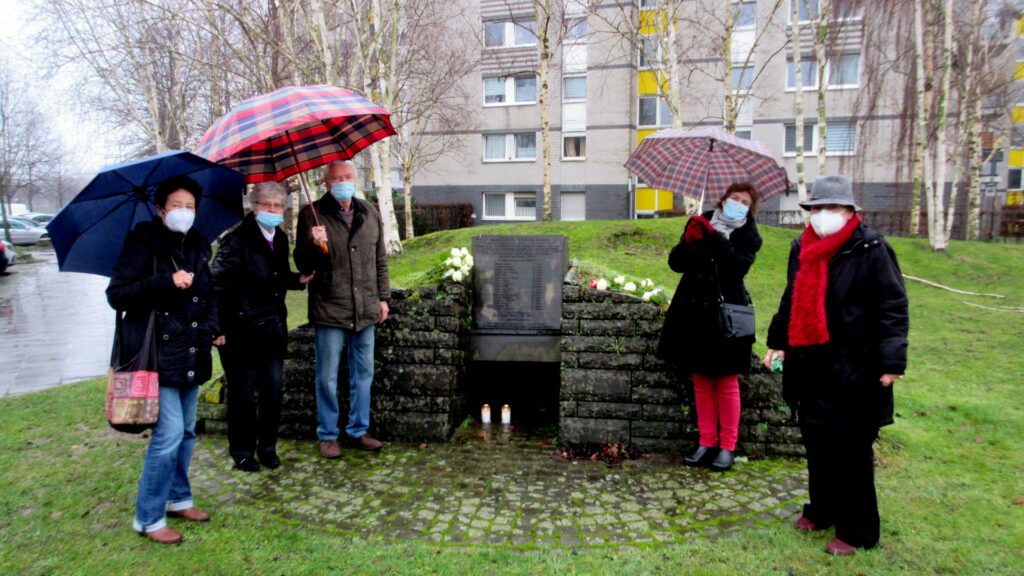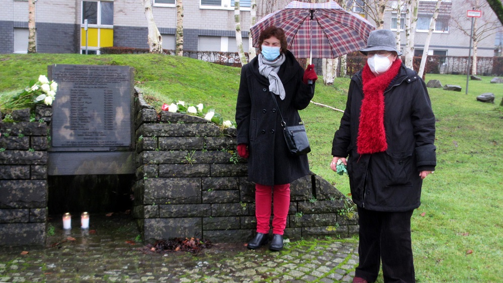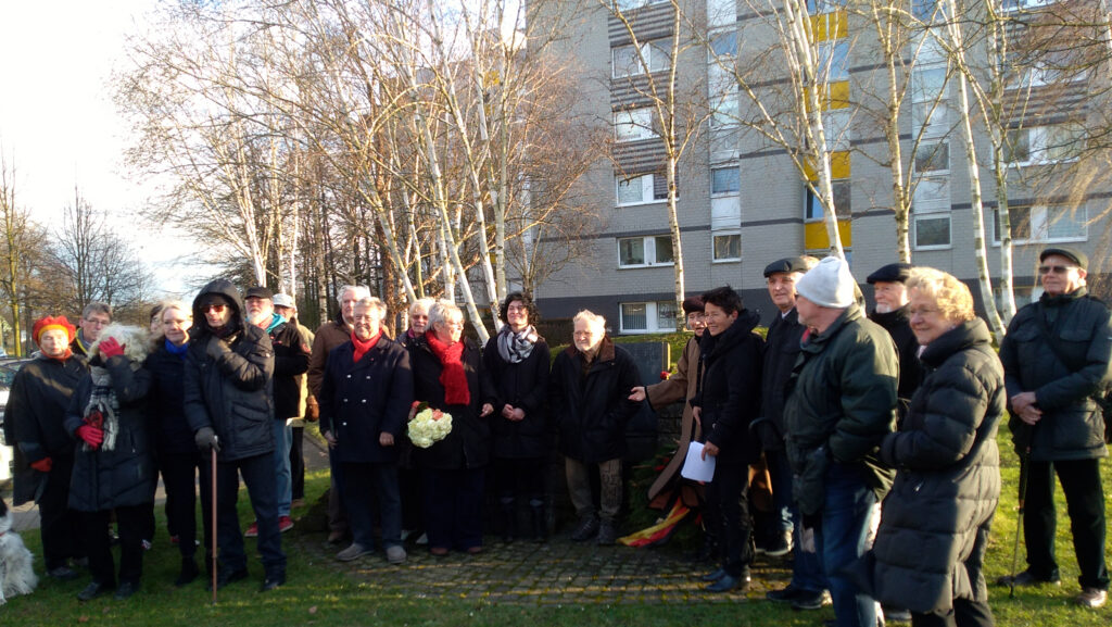 Am 28. Februar 2020 jährte sich der Gedenktag zum 75. Mal. Entsprechend groß war die Anzahl der Besucher und Trauergäste. Mehr als 35 Menschen waren fanden sich bei starkem Wind und Sonnenschein an der von der Werkstatt initiierten Gedenkstätte an der Ecke Hans-Schulten-Straße/Dattenfelder Straße ein. Nach der Begrüßung durch die Vorsitzende sprach die stellv. Bezirksbürgermeisterin Dr. Tanja Groß einige Worte zum Gedenken und schlug den Bogen bis heute, um an den Schwur von Buchenwald zu erinnern, dass von Deutschland nie wieder Krieg ausgehen darf.