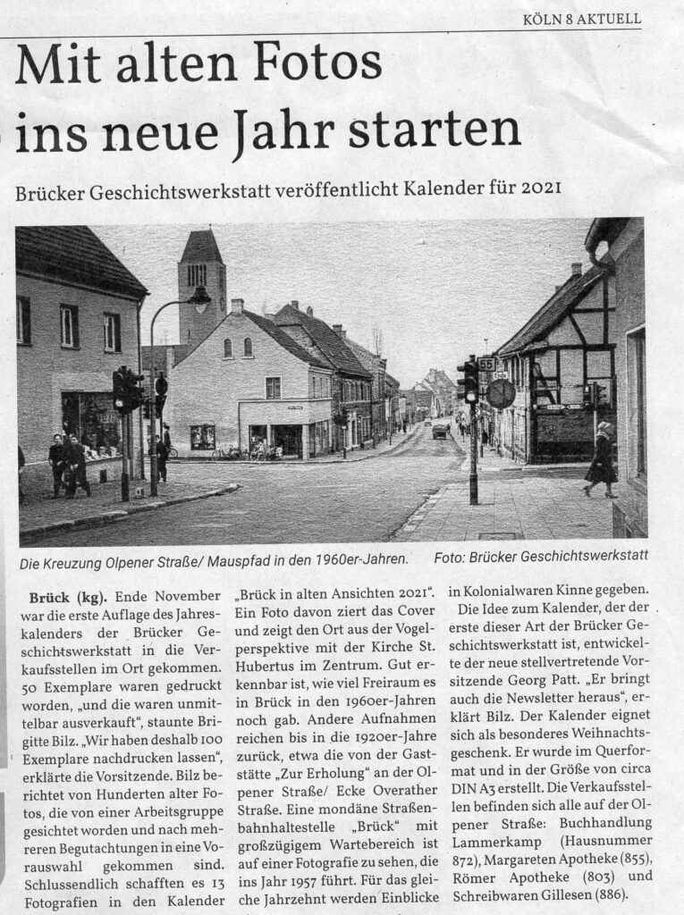 - Dank der Berichterstattung in sämtlichen Zeitungen erfreute sich der erste Wandkalender der Brücker Geschichtswerkstatt sehr großer Nachfrage. Es wurden drei Auflagen des großformatigen Kalenders gedruckt, und alle Exemplare waren bereits Mitte Dezember ausverkauft.